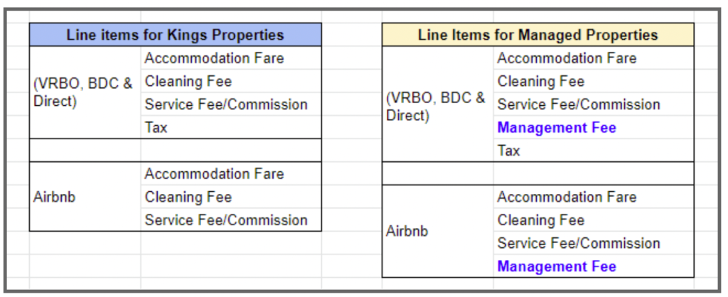 Total Payout | The amount an OTA or STRIPE will disburse to us | plus accommodations + cleaning plus tax (some OTAs) minus service fee (some OTAs) |